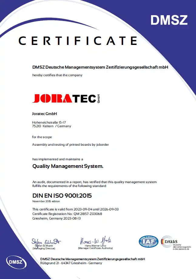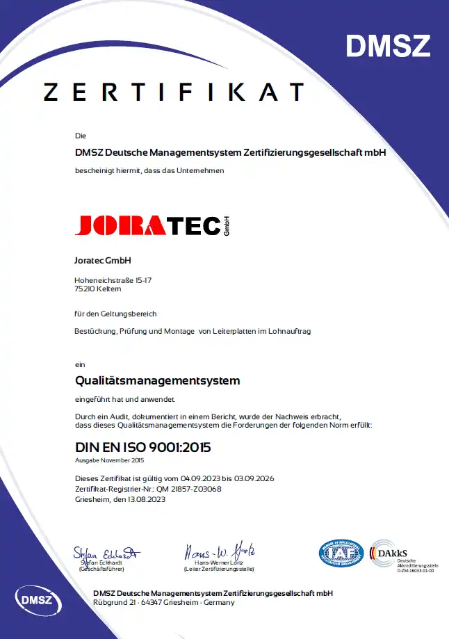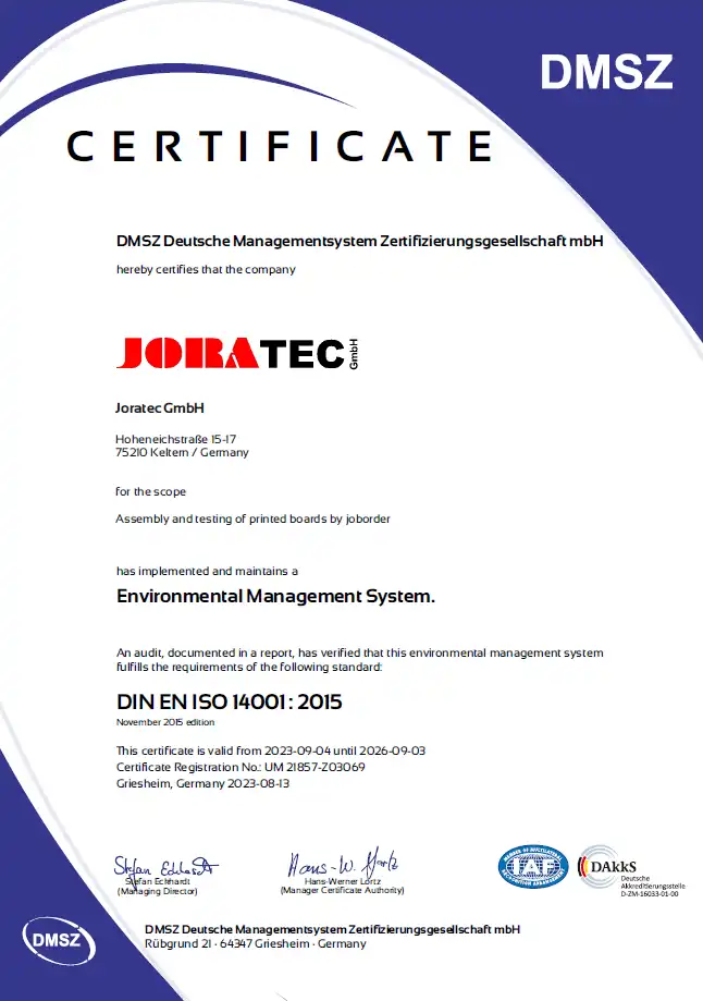 Als nach DIN EN ISO 9001 zertifiziertes Unternehmen mit integriertem Umweltmanagementsystem arbeitet Joratec auf Basis klar definierter und auditierter Prozesse. Qualitäts-, Umwelt- und Logistikstandards sind systematisch miteinander verknüpft und dokumentiert. Entscheidend ist jedoch die Qualifikation der Mitarbeiter: Regelmäßige Schulungen zu ESD-Schutz, EMV-Anforderungen und produktspezifischen Besonderheiten sichern die praktische Umsetzung im Alltag. So entsteht Prozesssicherheit nicht nur auf dem Papier, sondern im operativen Ablauf der Leiterplattenproduktion.